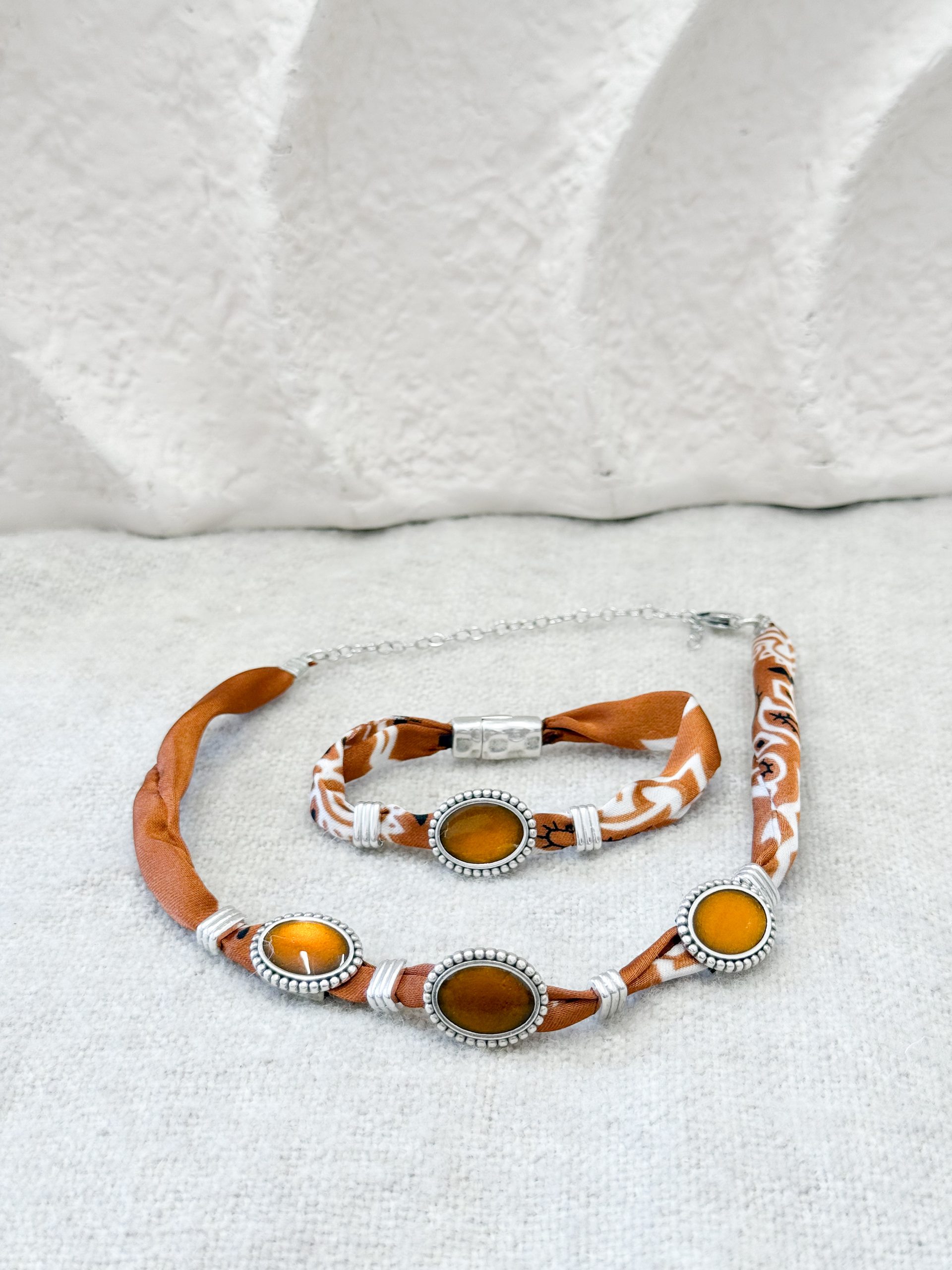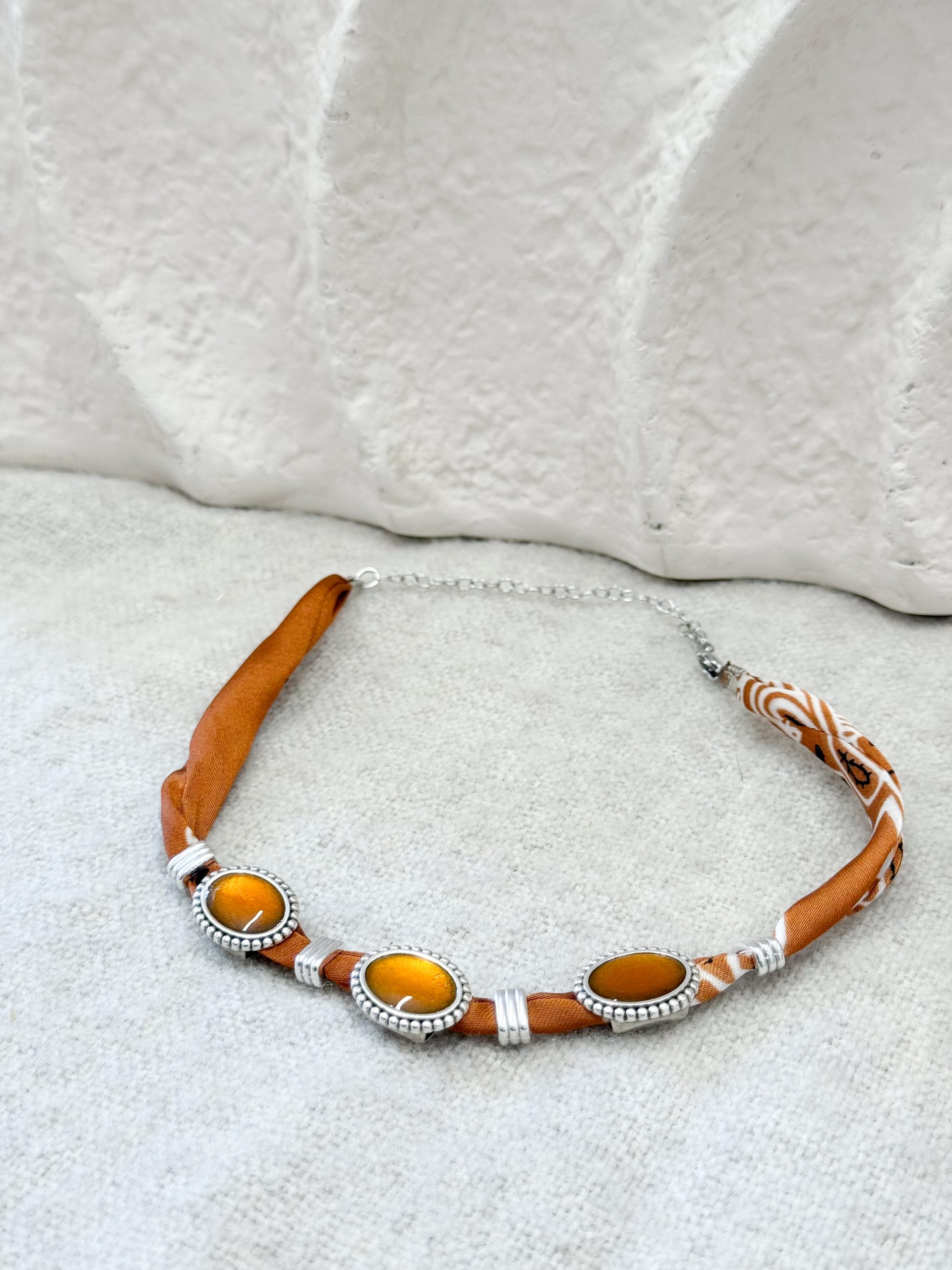 Κολιε σε ασημί αποχρώσεις και σατεν ύφασμα μπαντάνας.