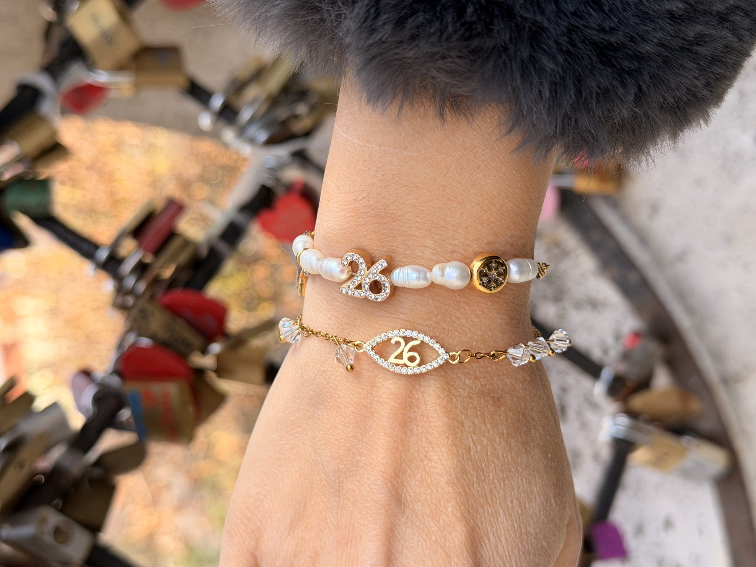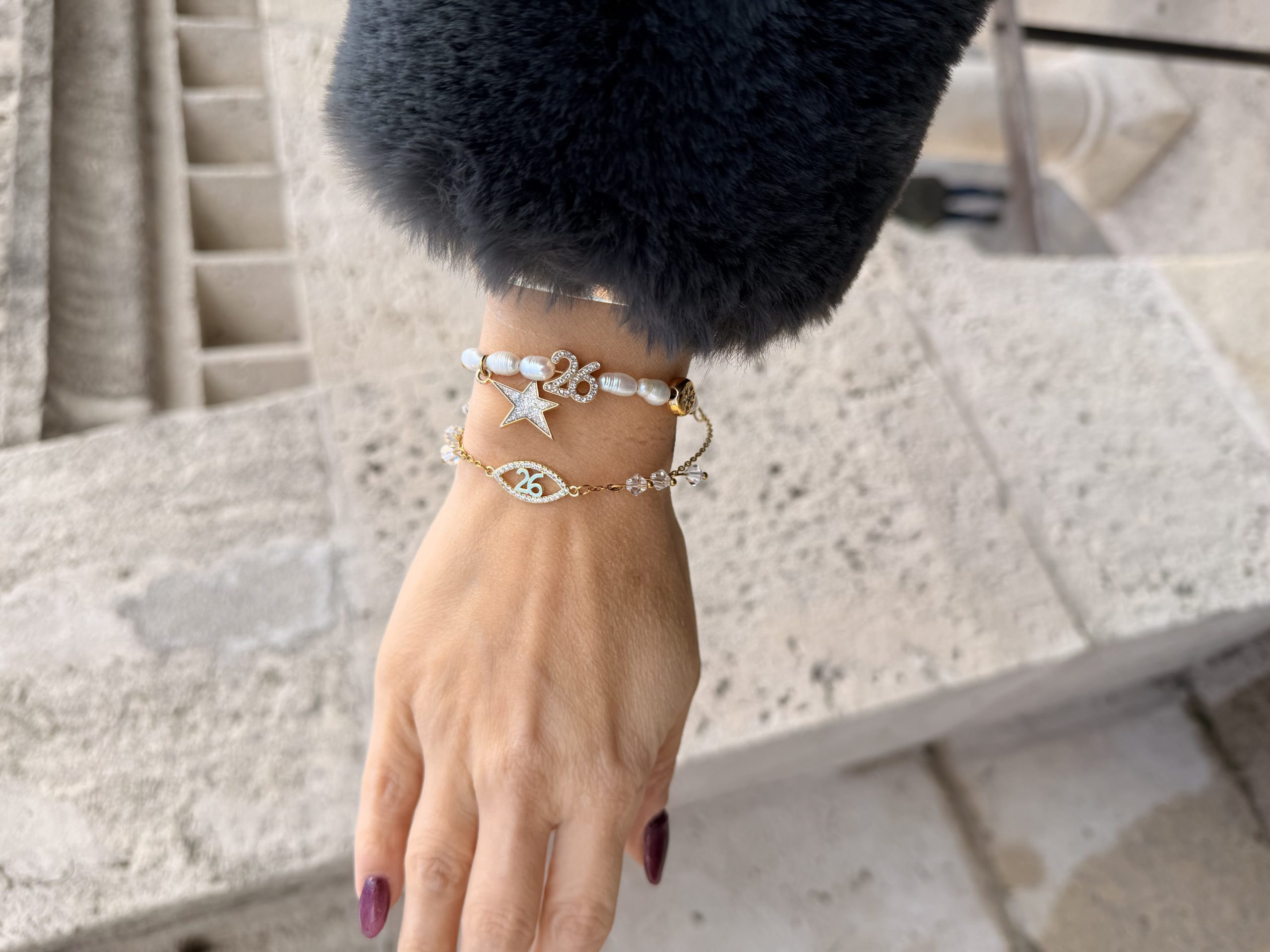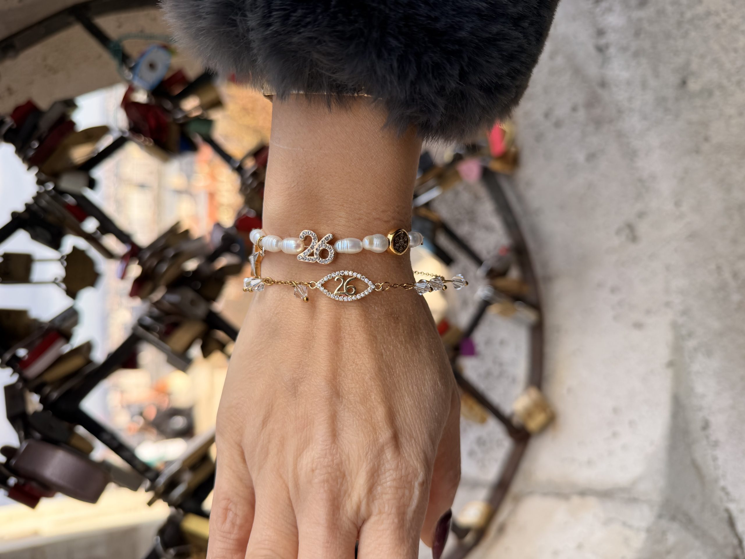 Βραχιολάκι γούρι με μαργαριτάρια και μοτίφ 26 με σβαροφσκι.