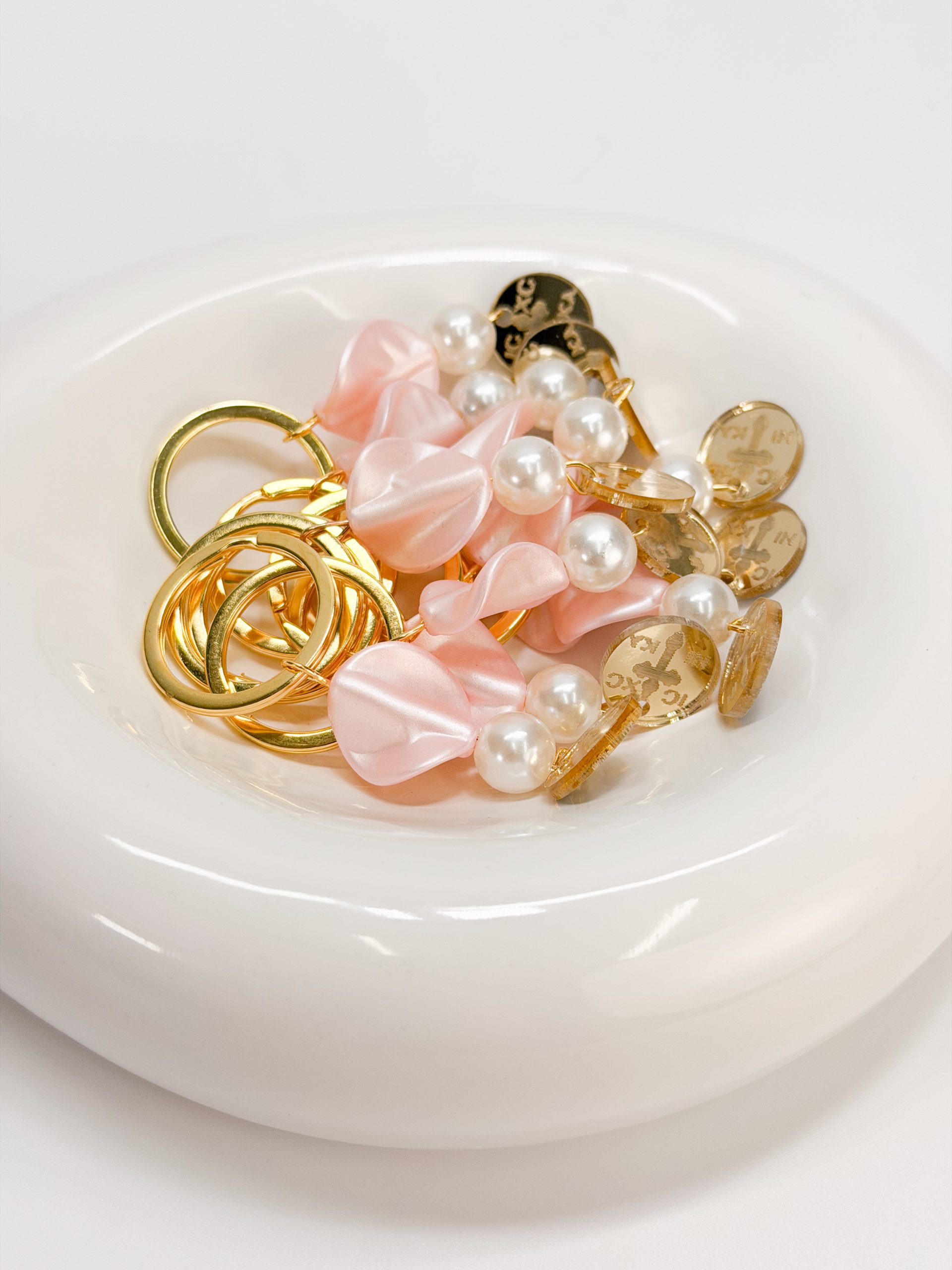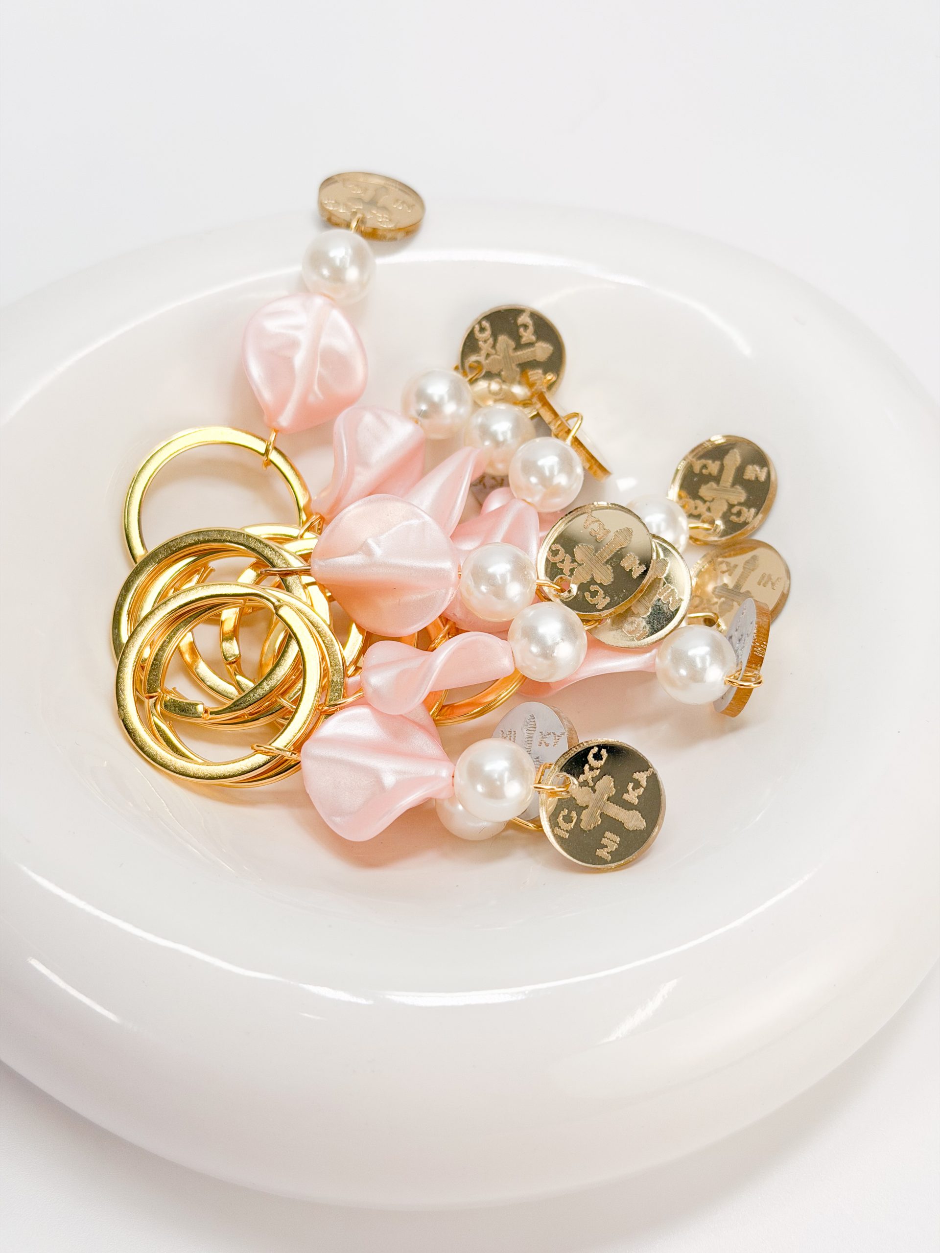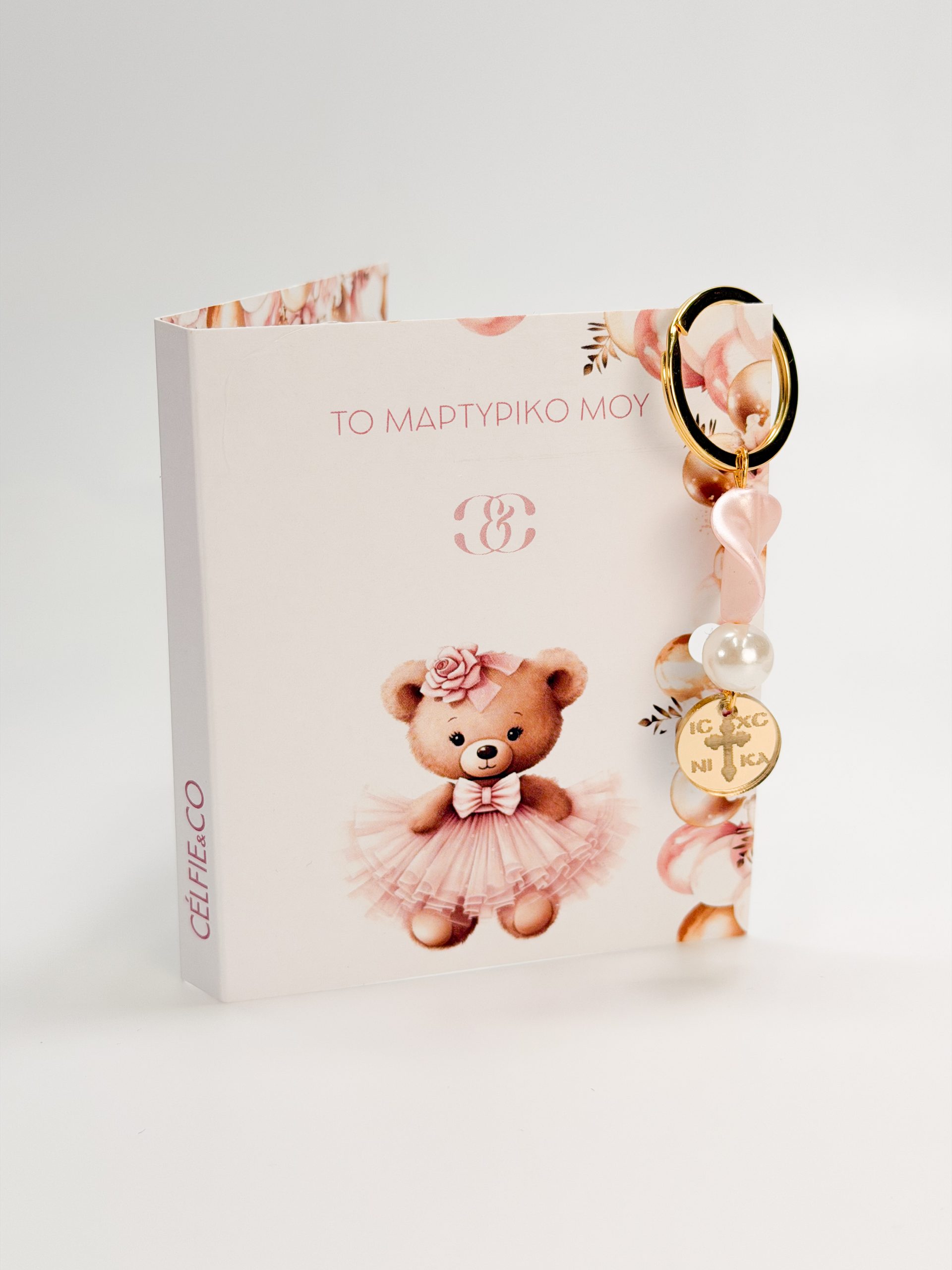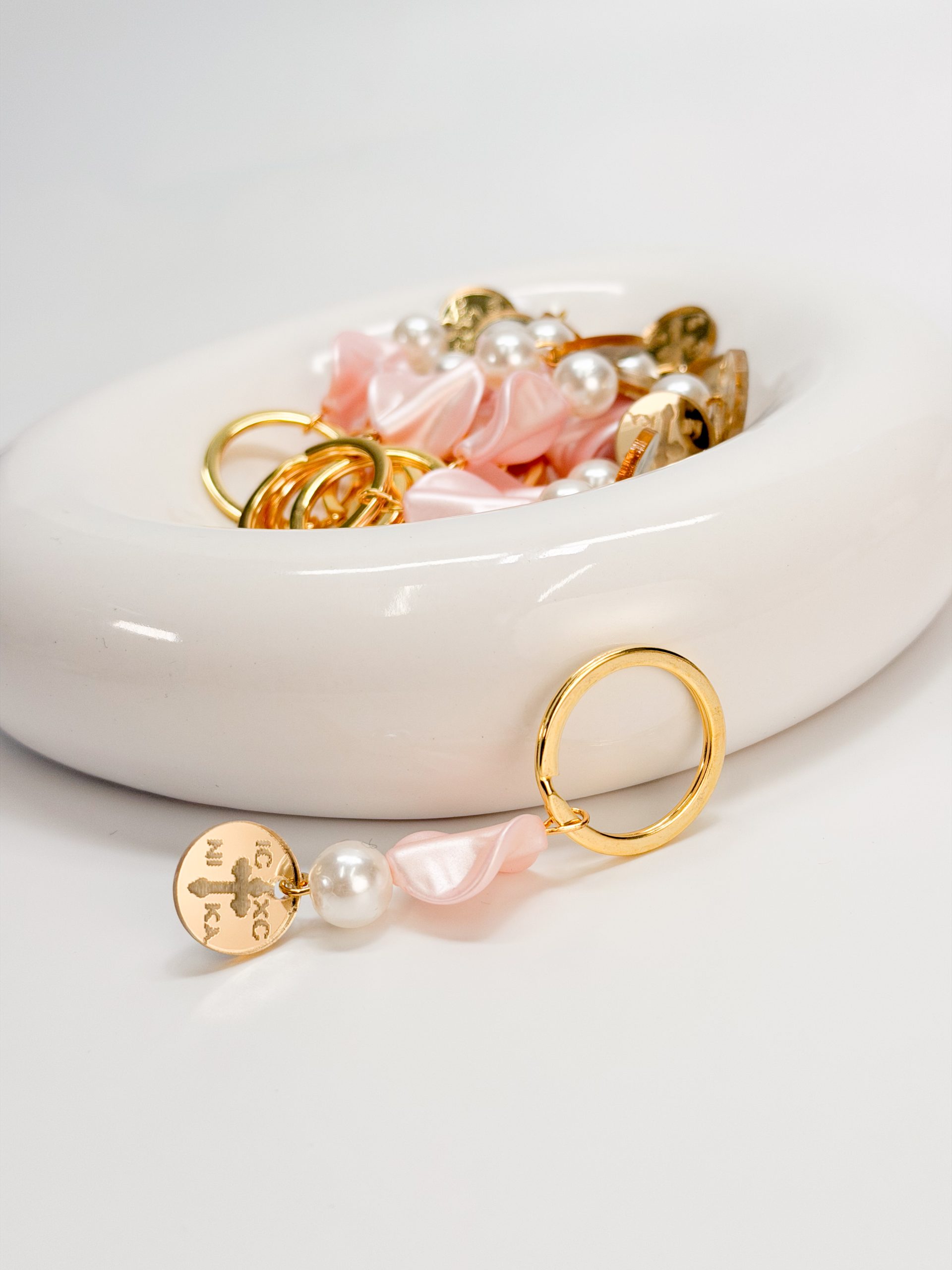 Μαρτυρικό μπρελοκ με πέρλα,πέταλο λουλουδιού και χρυσό plexiglass κωνσταντινάτο σταυρό.