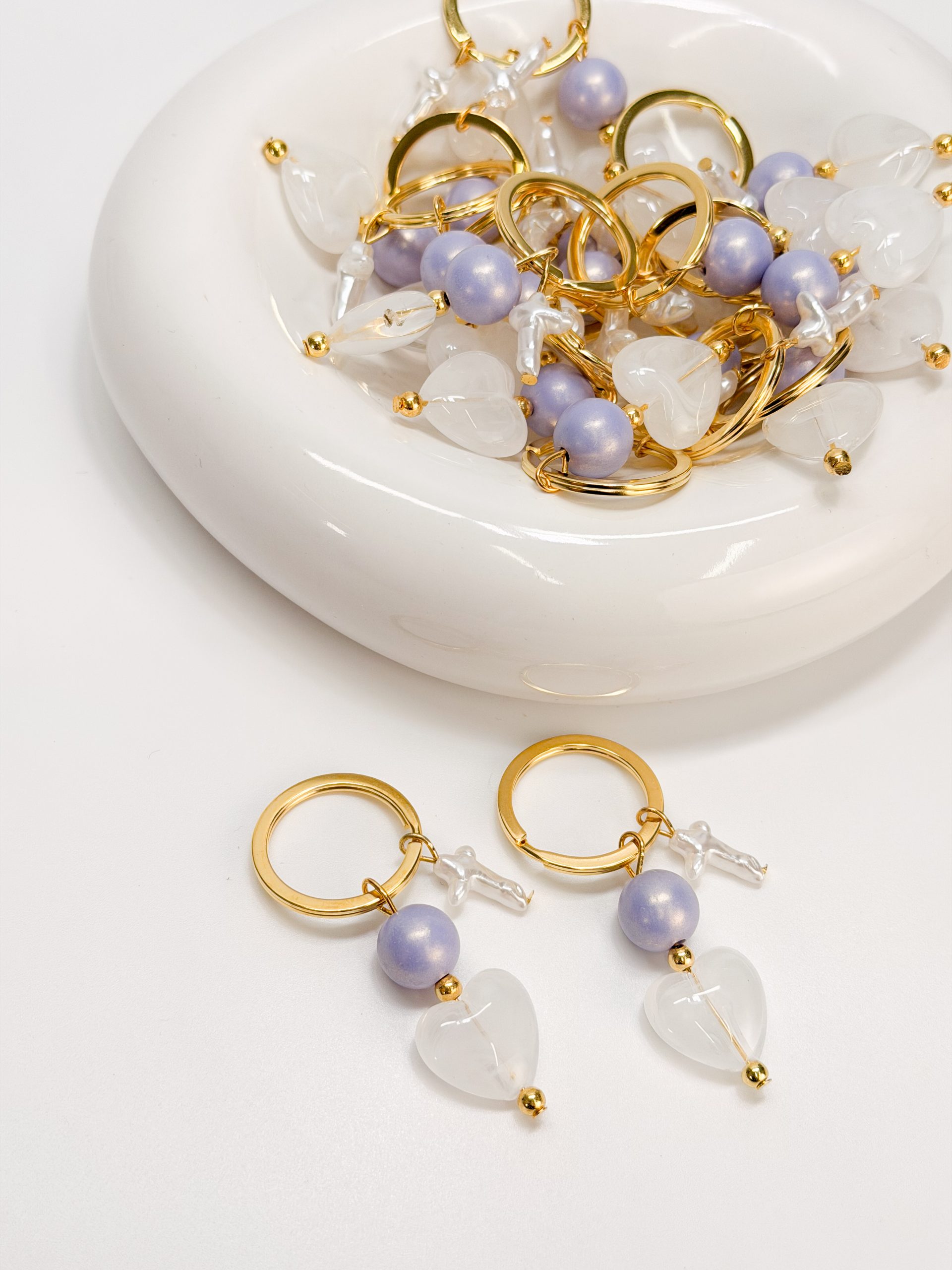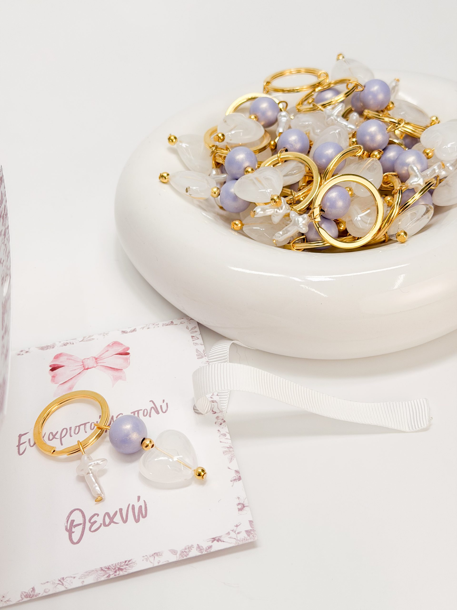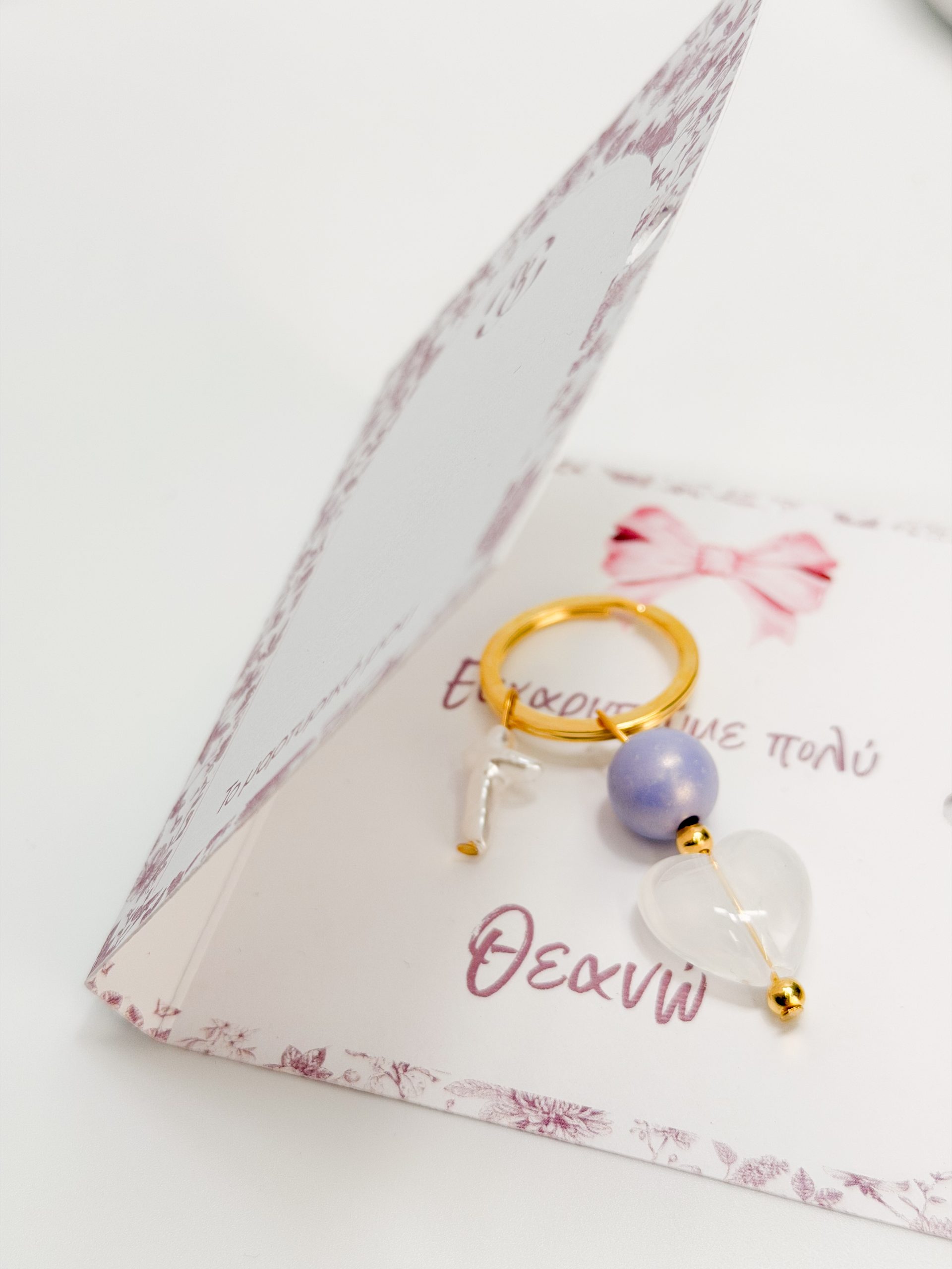 Μαρτυρικό μπρελοκ με περλέ σταυρό,λιλά χάντρα και μοτιφ καρδιά ακρυλική.