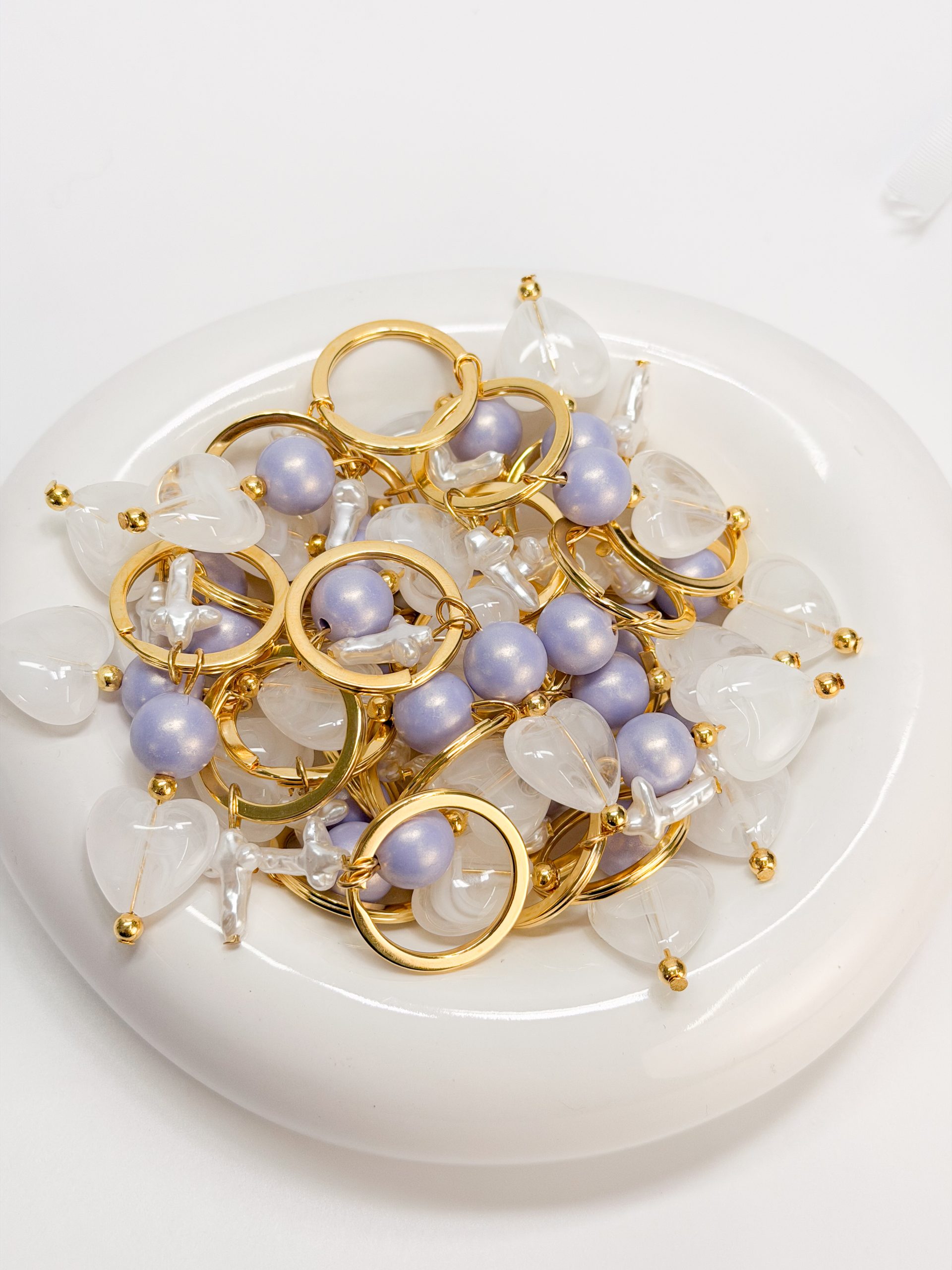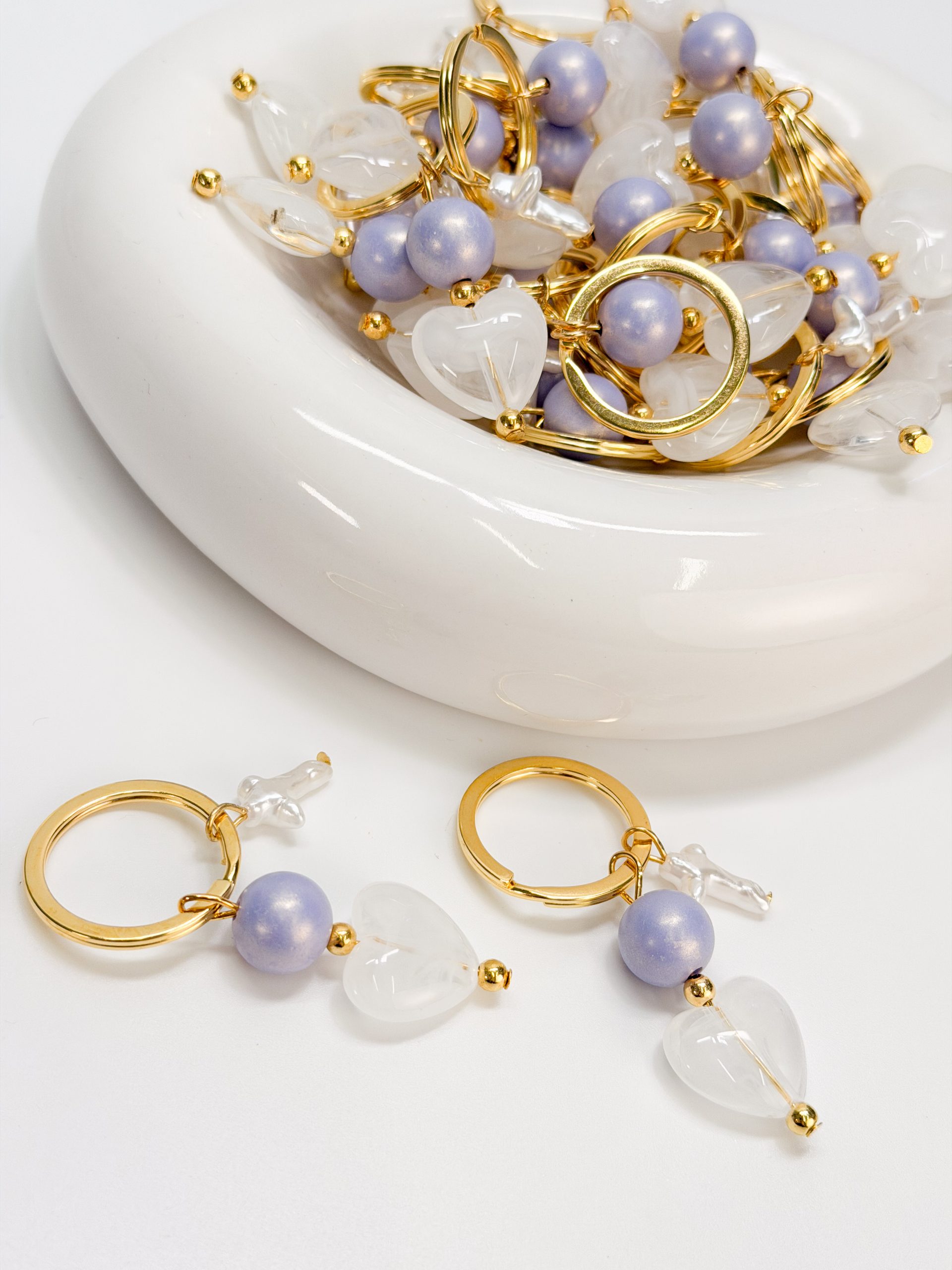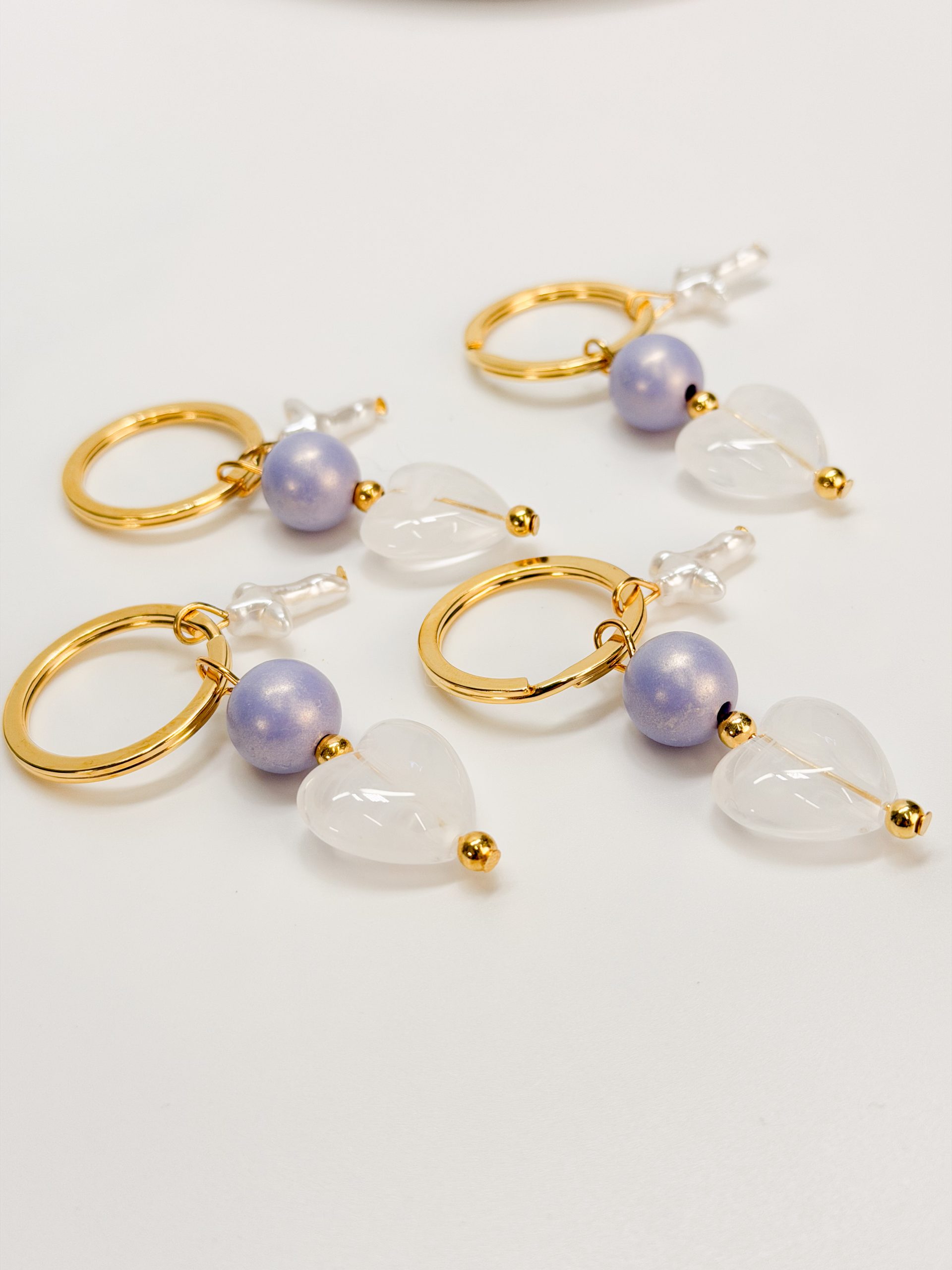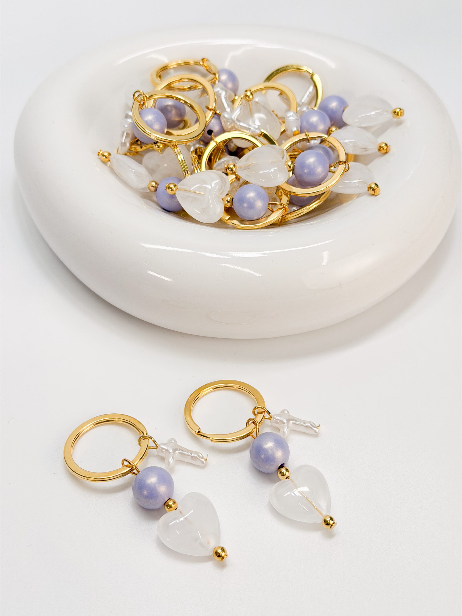 Μαρτυρικό μπρελοκ με περλέ σταυρό,λιλά χάντρα και μοτιφ καρδιά ακρυλική.