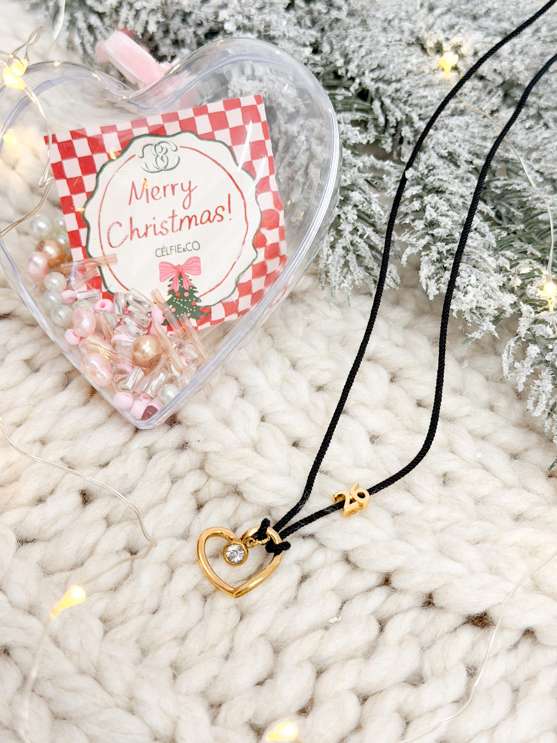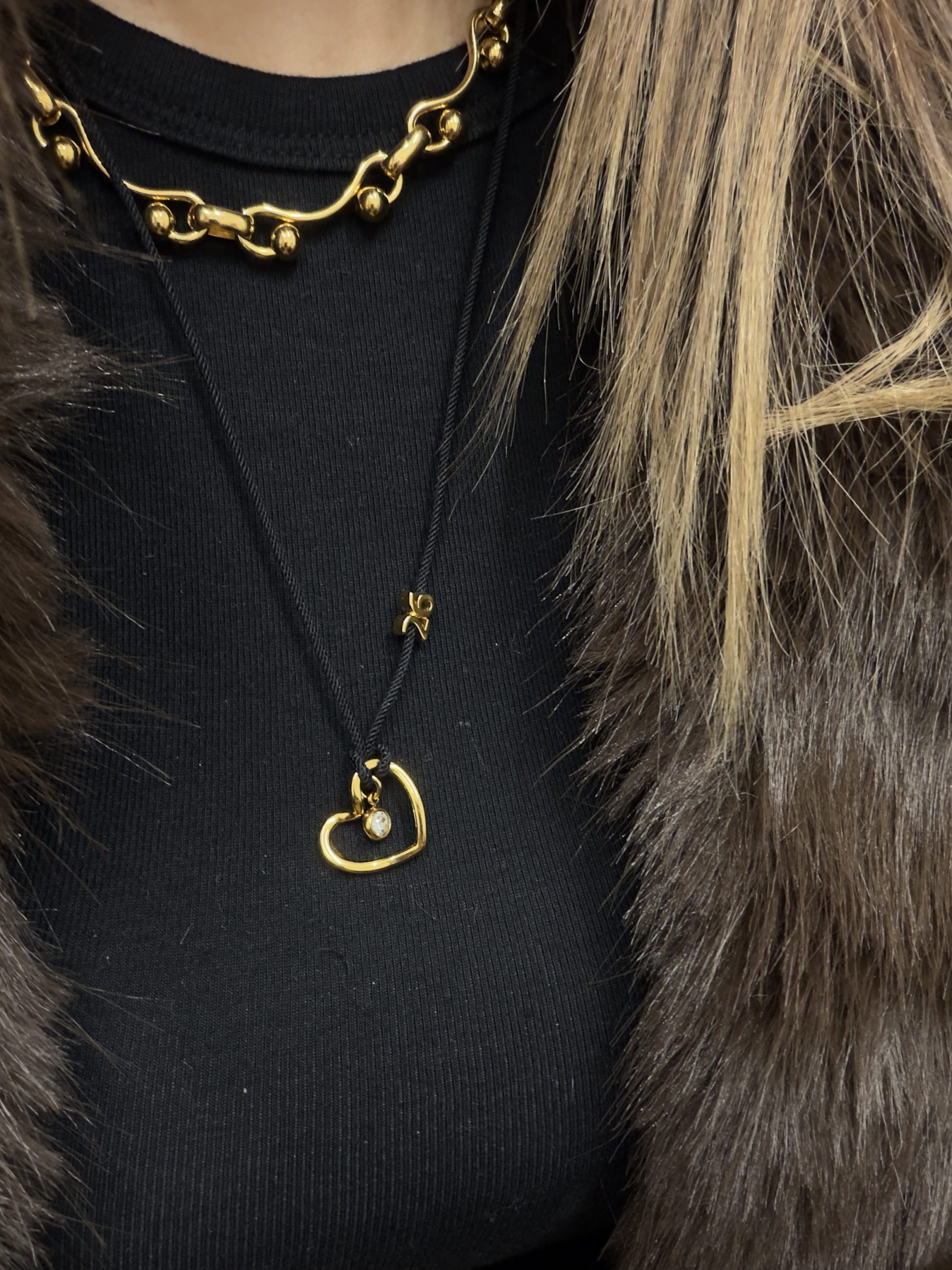 Κολιέ με μαύρο κορδόνι, ατσάλινο μοτίφ καρδιάς,σβαροφσκι και μοτίφ 26.